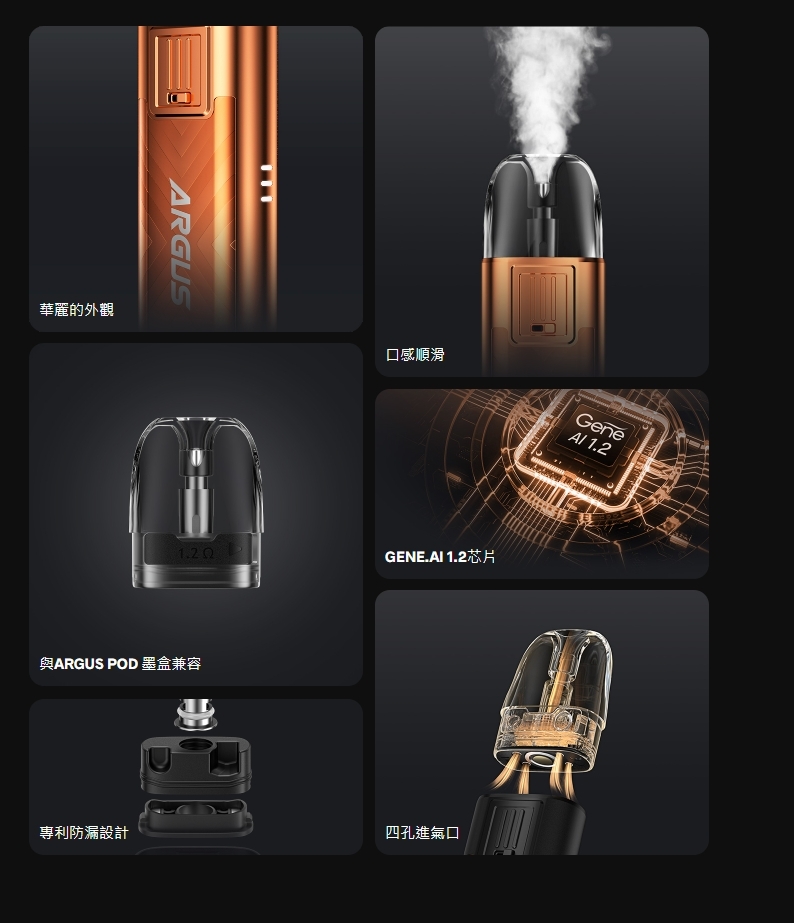 在保留鋅合金和皮革材質的經典優雅設計的同時, 創新了亮麗的新外觀和閃亮的裝飾飾面。 四孔進氣口確保口感順滑,多層防漏結構在ARGUS POD煙彈中有效發揮作用。 同時,其兩個版本墨盒完全相容於ARGUS G、ARGUS POD、ARGUS P1 和ARGUS Z。