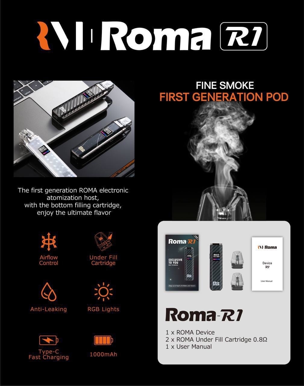 有精緻的外觀設計、簡單的易用性以及豐富的口味選擇,旨在為用戶營造更愉悅的吸煙體驗。🌟小蠻牛電子煙-羅馬R1簡介