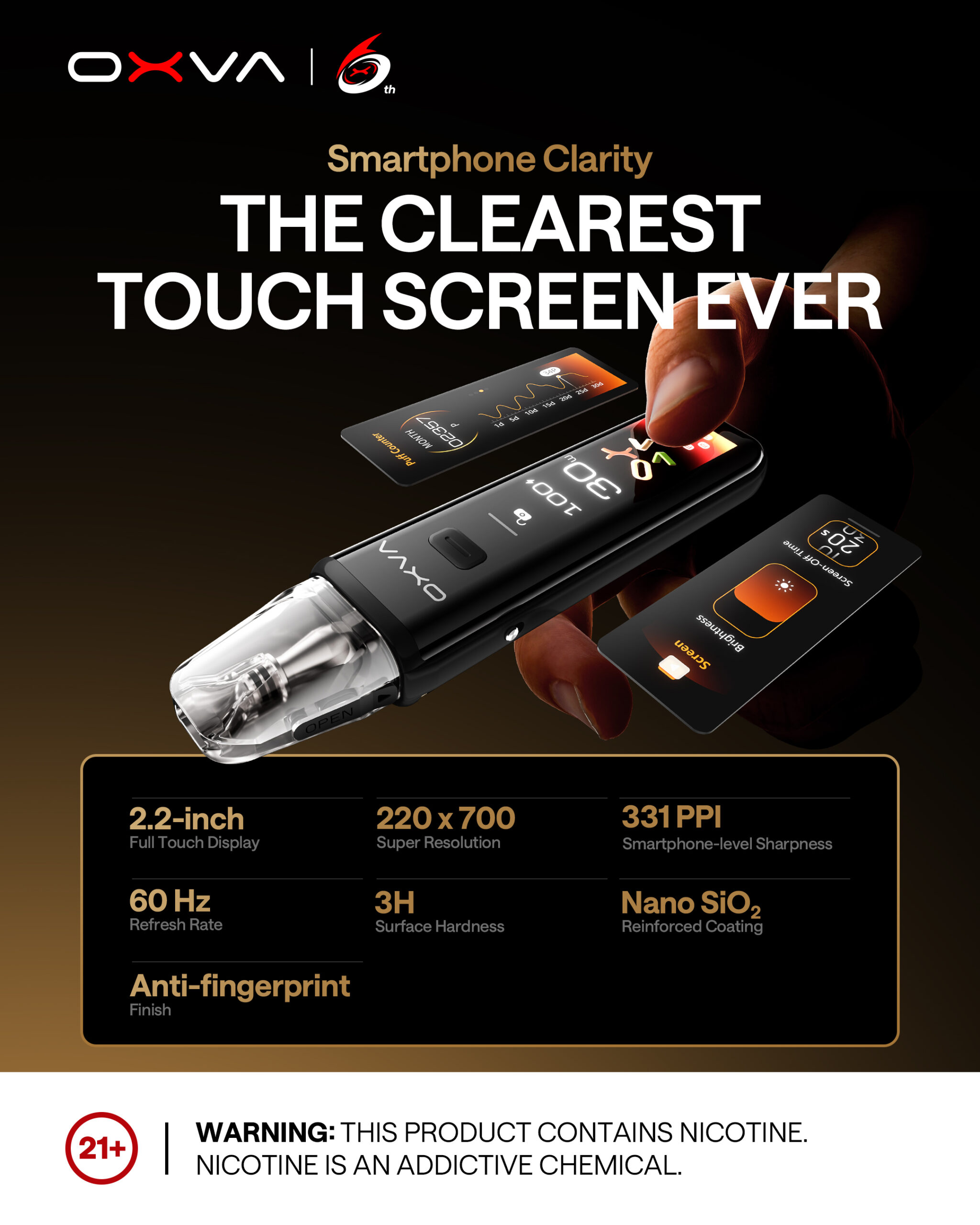 - 2.2 吋全彩觸控螢幕: 顯示電量、功率、阻值與吸氣次數。