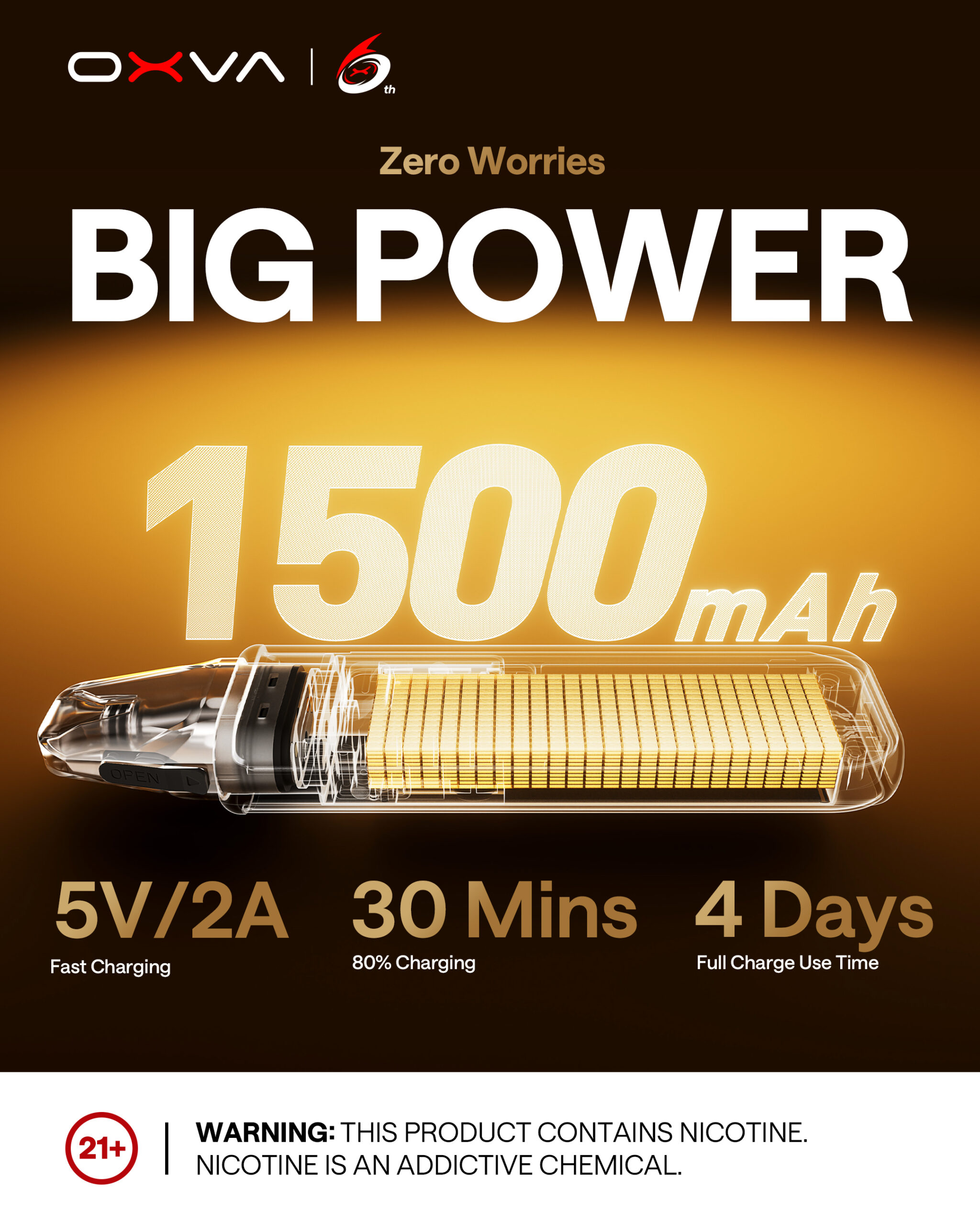 OXVA XLIM 3 ULTRA 採用 1500mAh 大容量電池,支援 2A 快速充電,