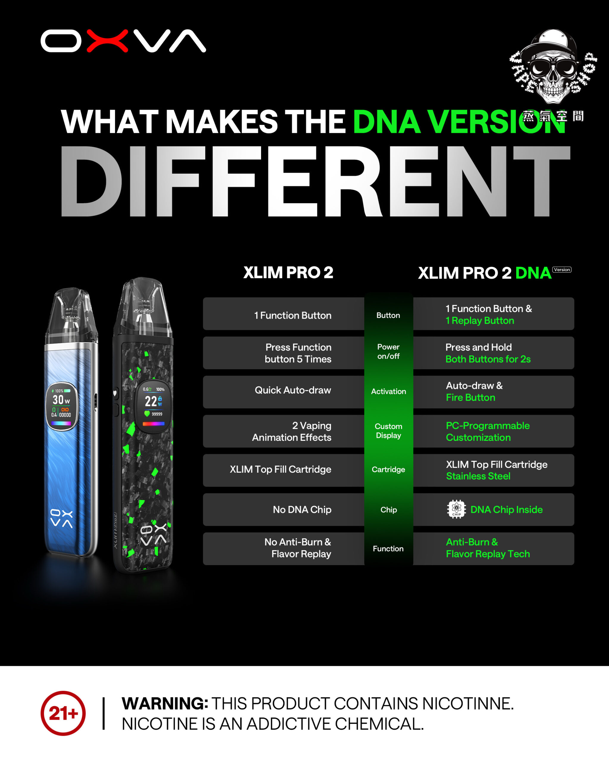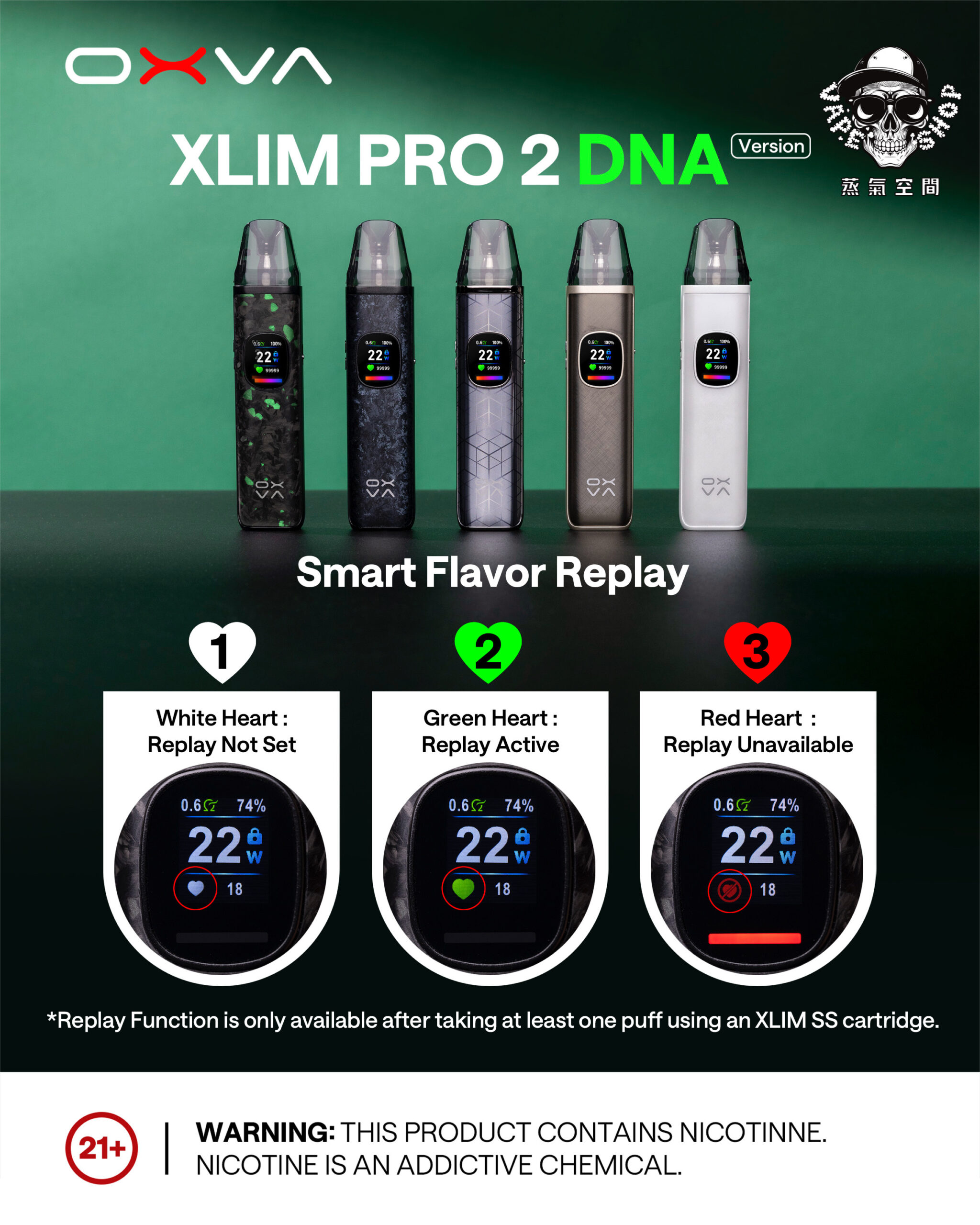 OXVA XLIM Pro 2 DNA,中文暱稱小蠻牛 DNA,是 XLIM 系列的旗艦級機型。首度搭載 Evolv DNA 晶片,支援 Replay 模式,結合 30W 調壓輸出、1300mAh 大電池與極致口感重現,是重度使用者與高端客戶的首選。