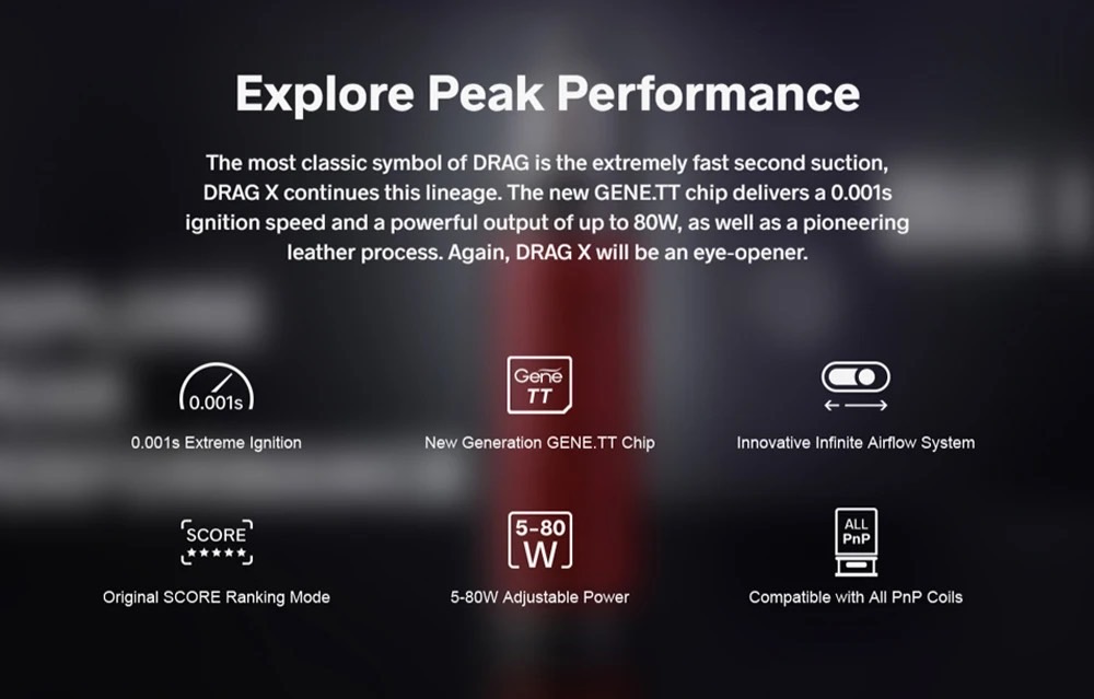 DRAG最經典的標誌就是極速秒吸,DRAG X延續了這一血統。全新 GENE.TT 芯片提供 0.001 秒的點火速度和高達 80W 的強大輸出,以及開創性的皮革工藝。