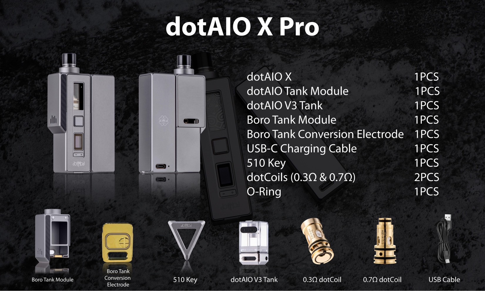 • 1 x Boro Tank 轉換電極(僅限 Pro 套件)
