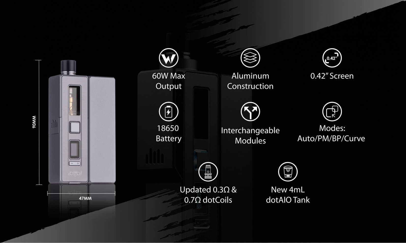 • 全模組化設計: dotAIO X 採用創新的模組化設計,允許用戶無縫切換不同的吸煙風格。無論您偏好 dotAIO 霧化器、Boro 霧化器,或是您的 RDA,dotAIO X 都能輕鬆滿足您的需求。只需更換霧化器模組,並輕鬆重新組裝,即可實現個性化的吸煙體驗。