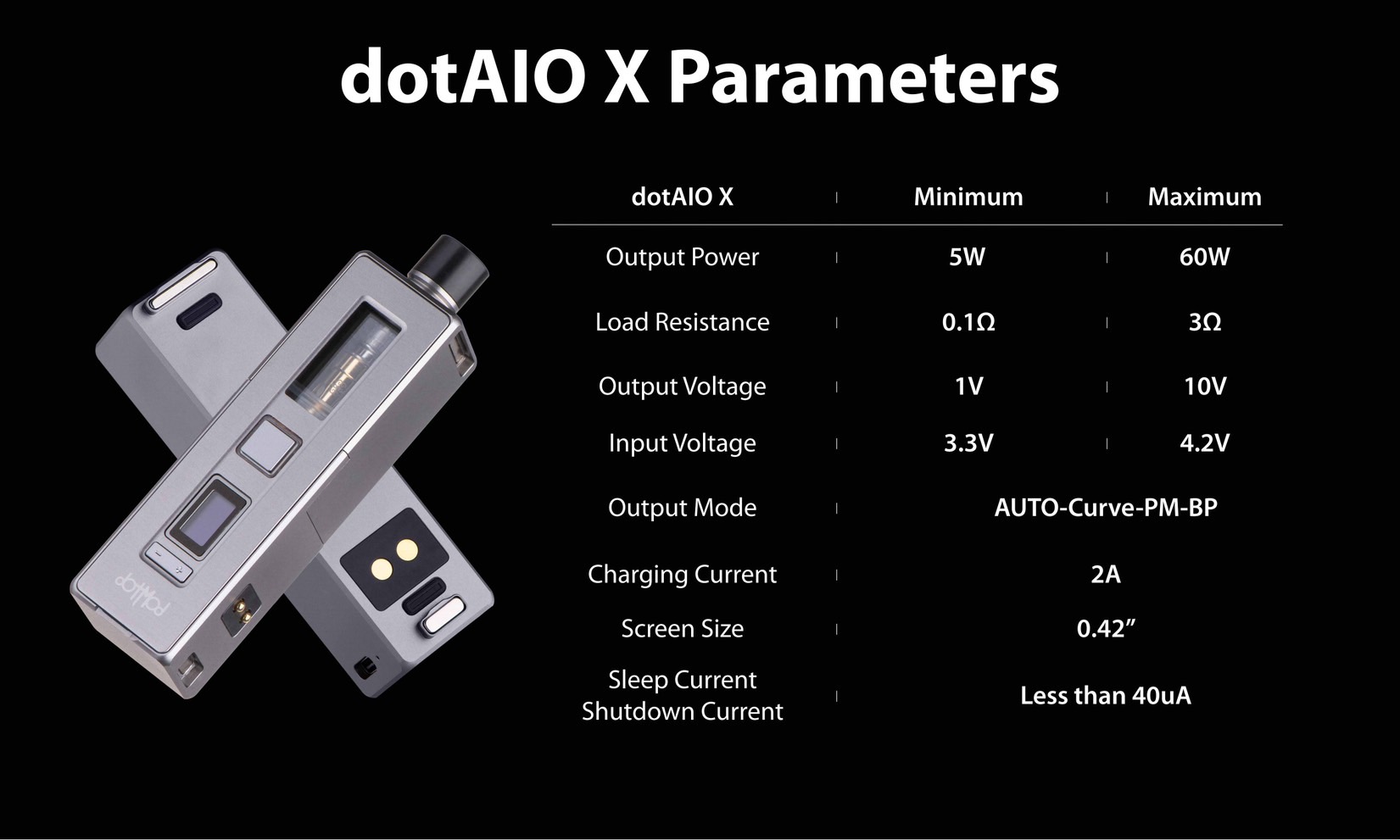 • 60W 最大輸出功率: dotAIO X 提供高達 60W 的輸出功率,確保強烈的風味和豐富的蒸氣。